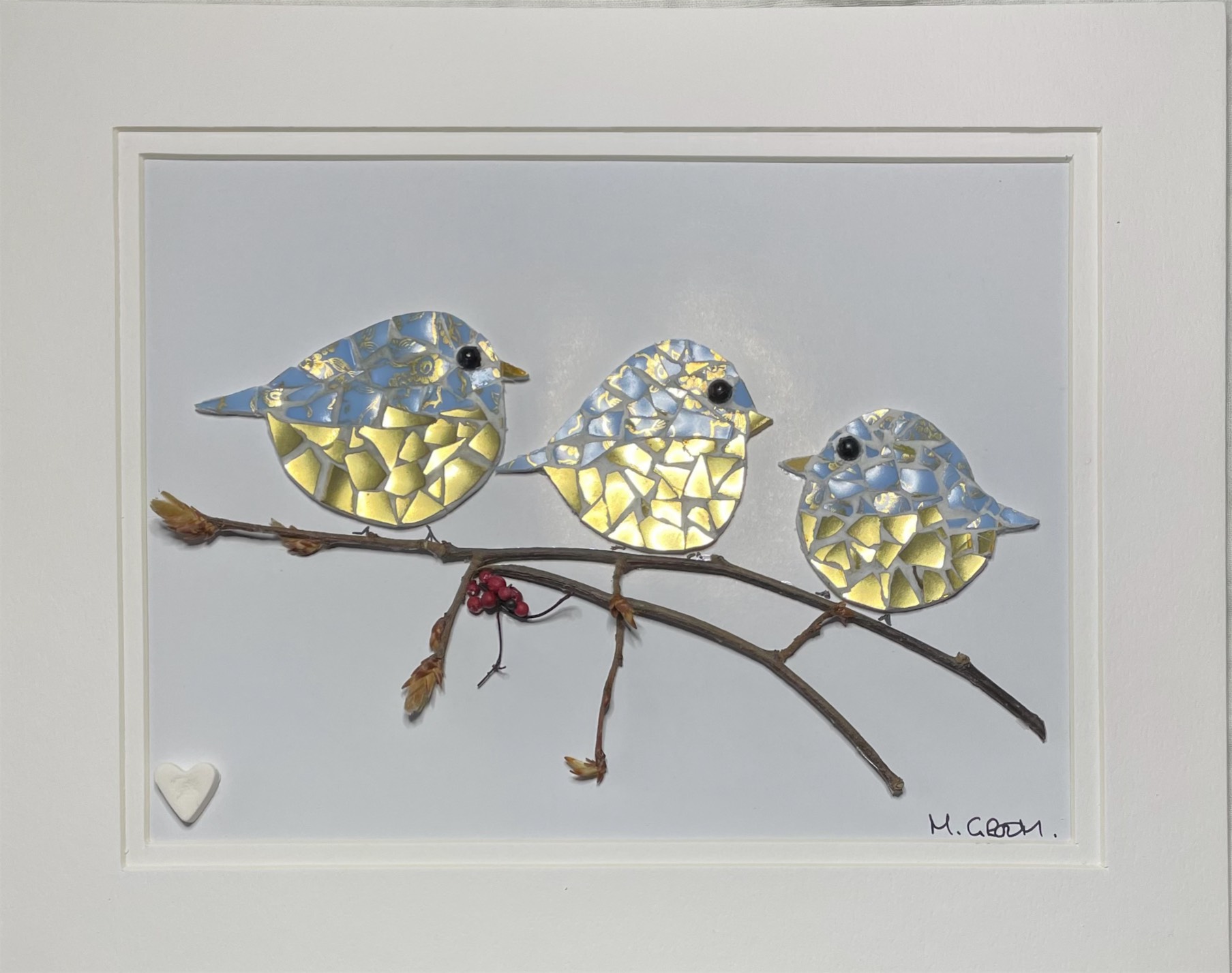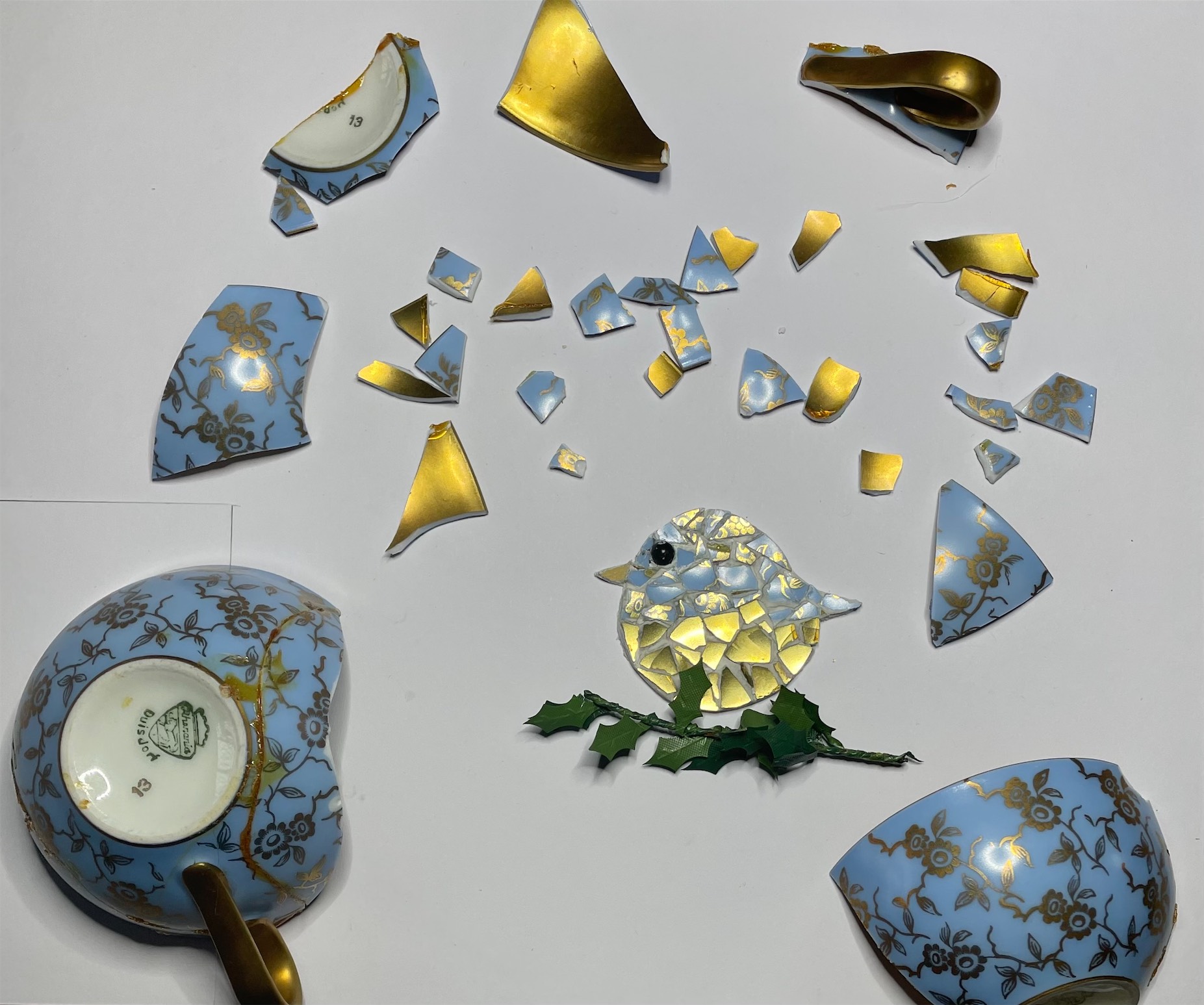 A local lady recently gave me two teacups that clearly had great sentimental value because they had been damaged and glued together several times. Telling me she had just lost her husband, she asked for a picture made from the cups, but was very specific about the design - 3 fat little birds on a twig. She even provided the beads for their eyes, and asked me to use only material from the cups. I made the picture, and from the unused shards then made two more birds, which have also now flown the nest.