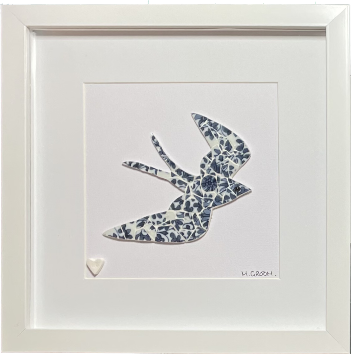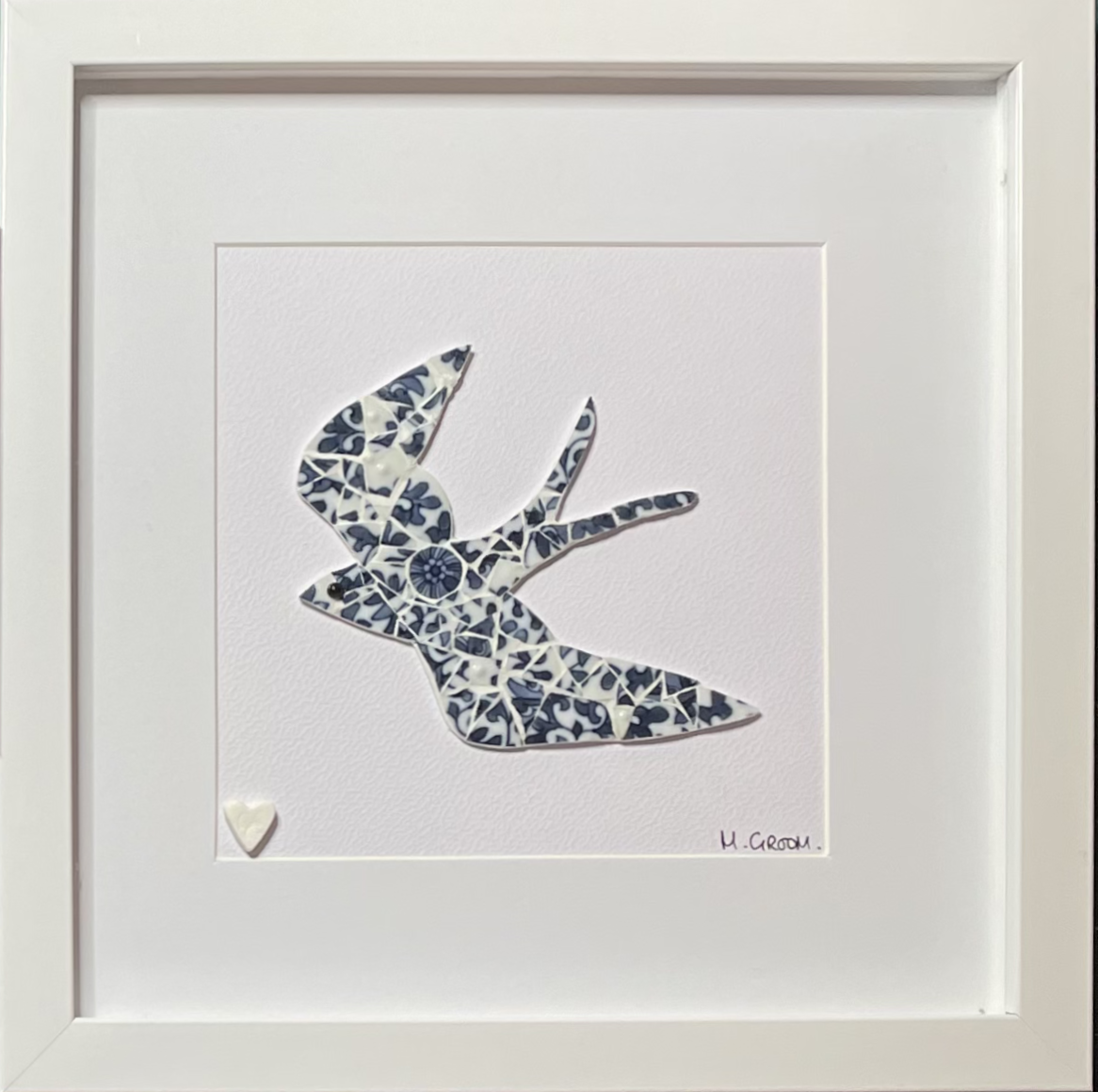Joe helped us with our garden when we moved into our home. The Farm had been unoccupied for years, and Joe was retained by the previous owners to keep the garden under control. Joe kindly agreed to help us when we moved in, which he did for the remaining years of his life. I asked his daughter if I could have something of Joe's to create a memory of him and she gave me some old cups & saucers. From a single cup and saucer I made a "Dove of Peace" that proudly resides in our hallway. It is a constant reminder of Joe and a great talking point. From this work I have recreated many similar pieces, using donated items by clients wanting a memory of their loved ones